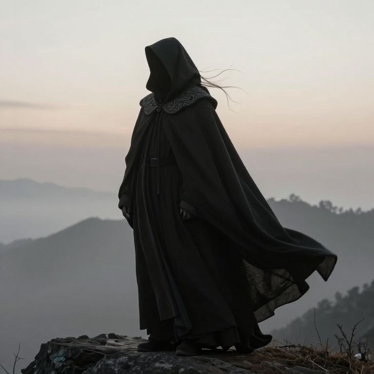 High collar cloak enveloping a mysterious figure standing on a misty mountain ridge at dawn, intricate embroidery along the collar, flowing fabric catching the wind, ethereal atmosphere, muted color palette, fantasy art style