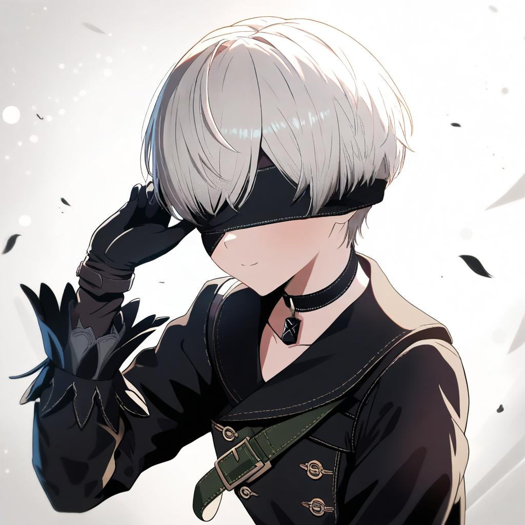 9s (nier:automata), nier (series), 1boy, white hair, short hair, black gloves, black choker, long sleeves, black blindfold, by artist ex idol, animagine