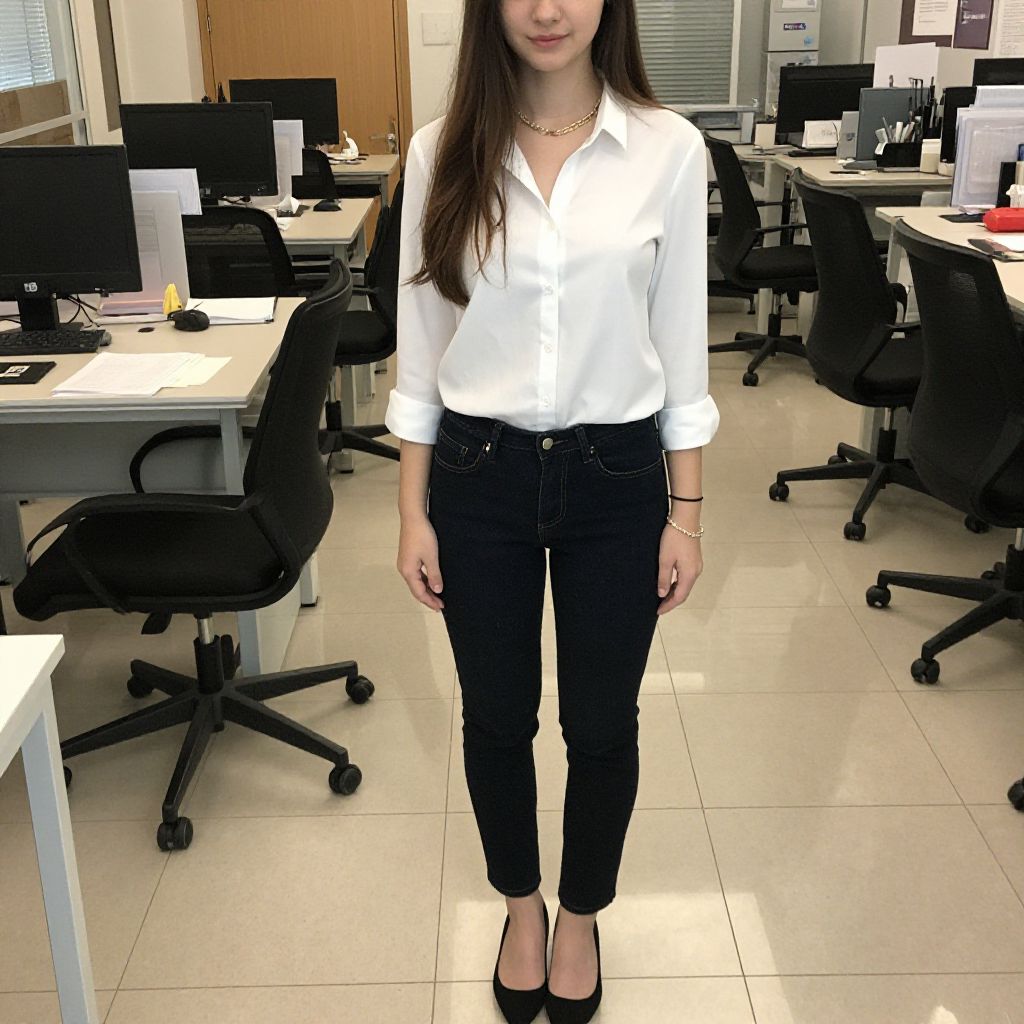 "office tops costume, solo, pants, shirt, realistic, 1girl, long hair, photorealistic, denim, full body, standing, looking at viewer, brown hair, shoes, jeans, white shirt, black pants, collared shirt, jewelry, bracelet, shop Realistic photo of casual sexy person with pretty face"
