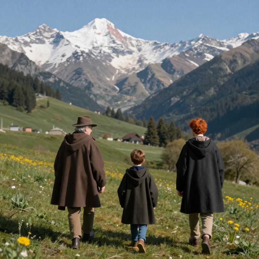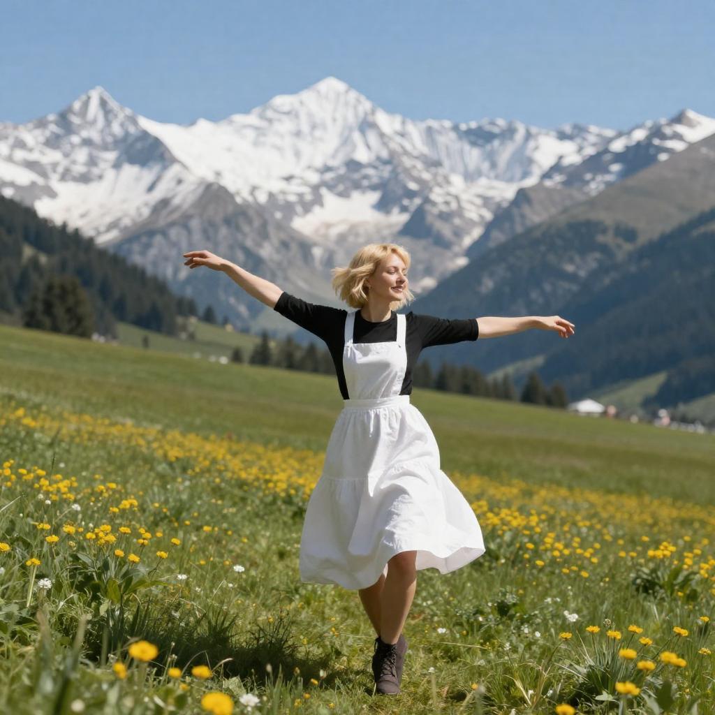 A young woman with short blonde hair wearing a black long-sleeve top and white pinafore dress joyfully dances with arms outstretched in a green meadow filled with yellow wildflowers. The scene is set in bright daylight with snow-capped mountains and a clear blue sky in the backdrop, capturing an alpine landscape.