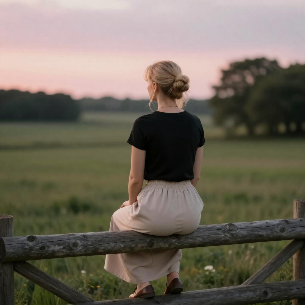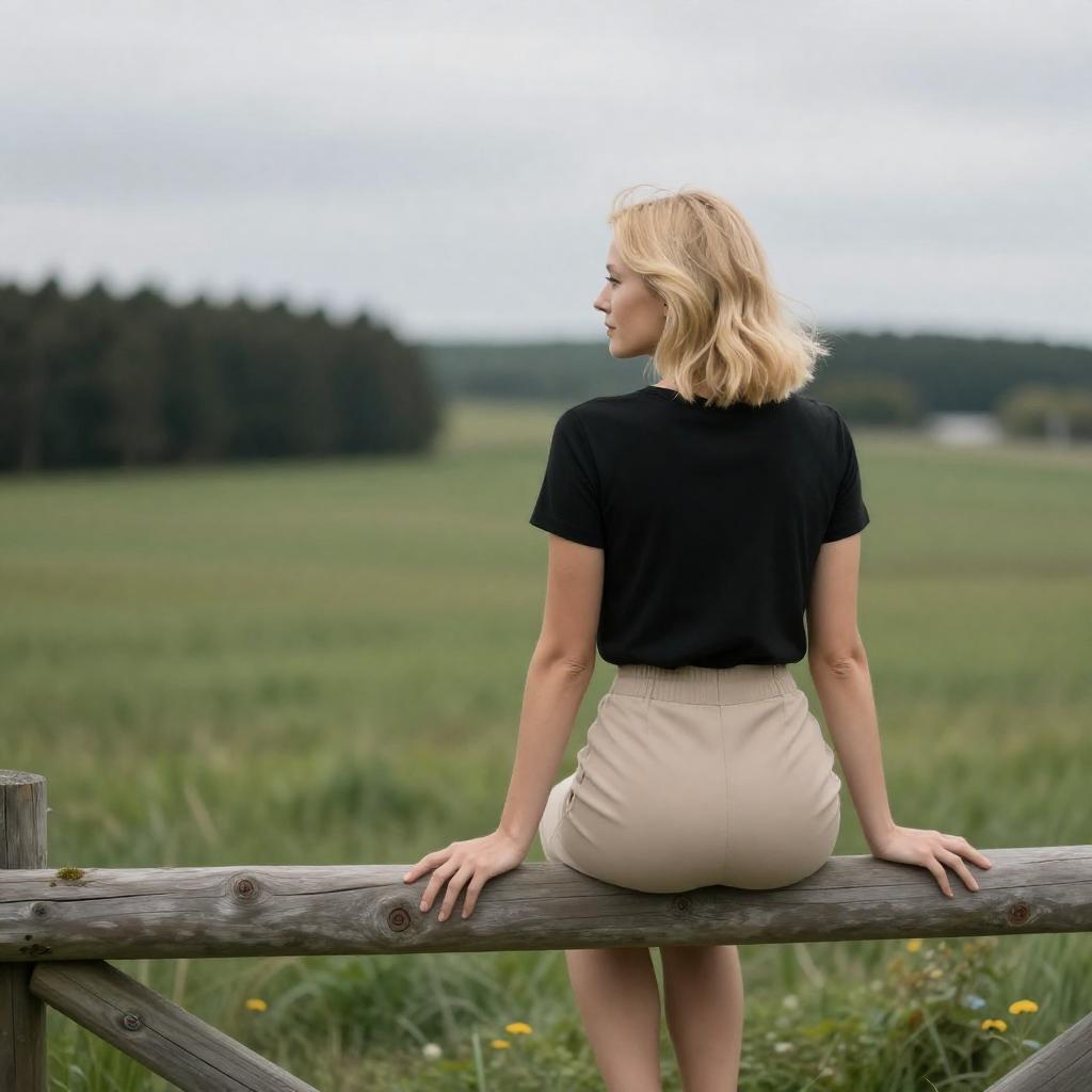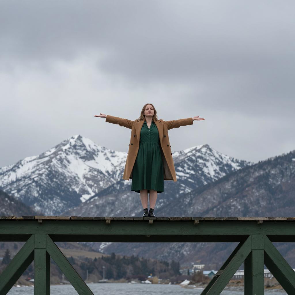 Woman with short blonde hair, arms outstretched, wearing black top and white pinafore dress, dancing in green meadow with yellow flowers. Snow-capped mountains and blue sky in background. Bright daylight. Woman smiling. Single person. Alpine landscape.