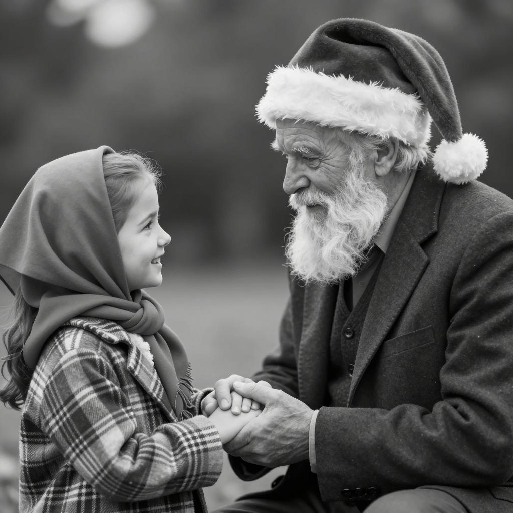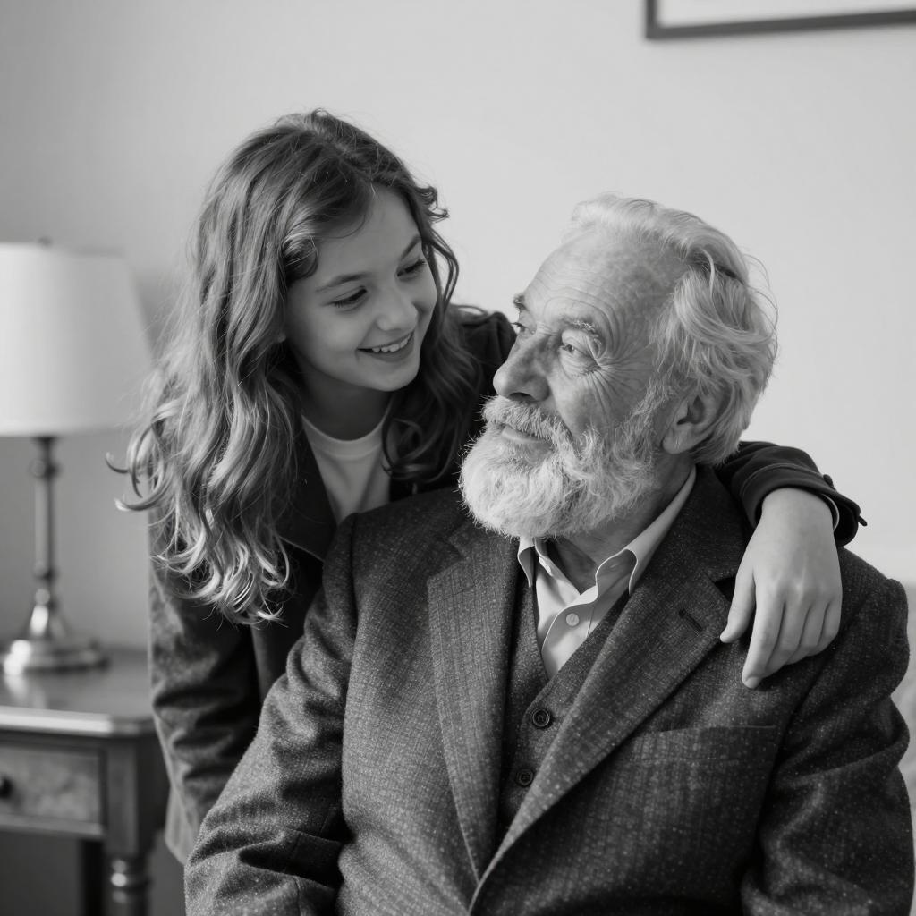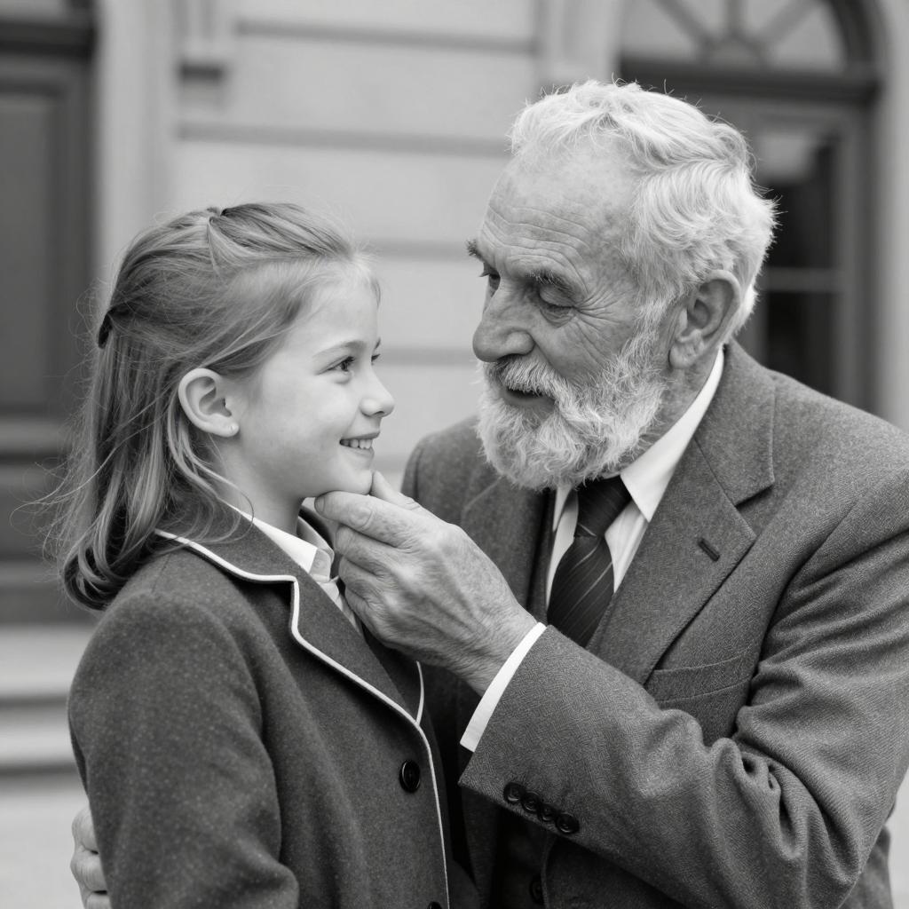 Black and white photograph of an elderly man with a white beard and a young girl with light-colored hair. Man wearing a suit and tie, girl in a coat with white piping. Man holds girl's chin gently, girl smiles. Background shows architectural details. Man's expression is gentle, girl's expression is joyful.