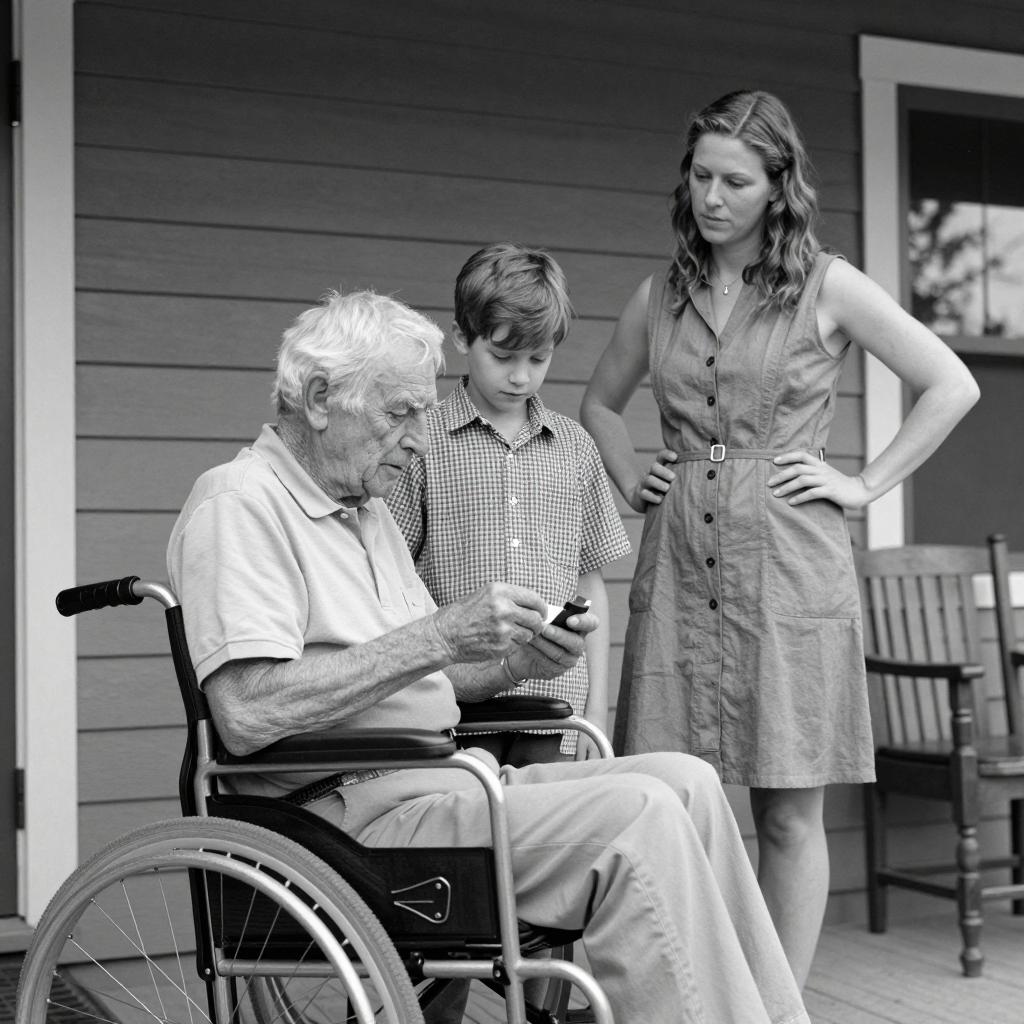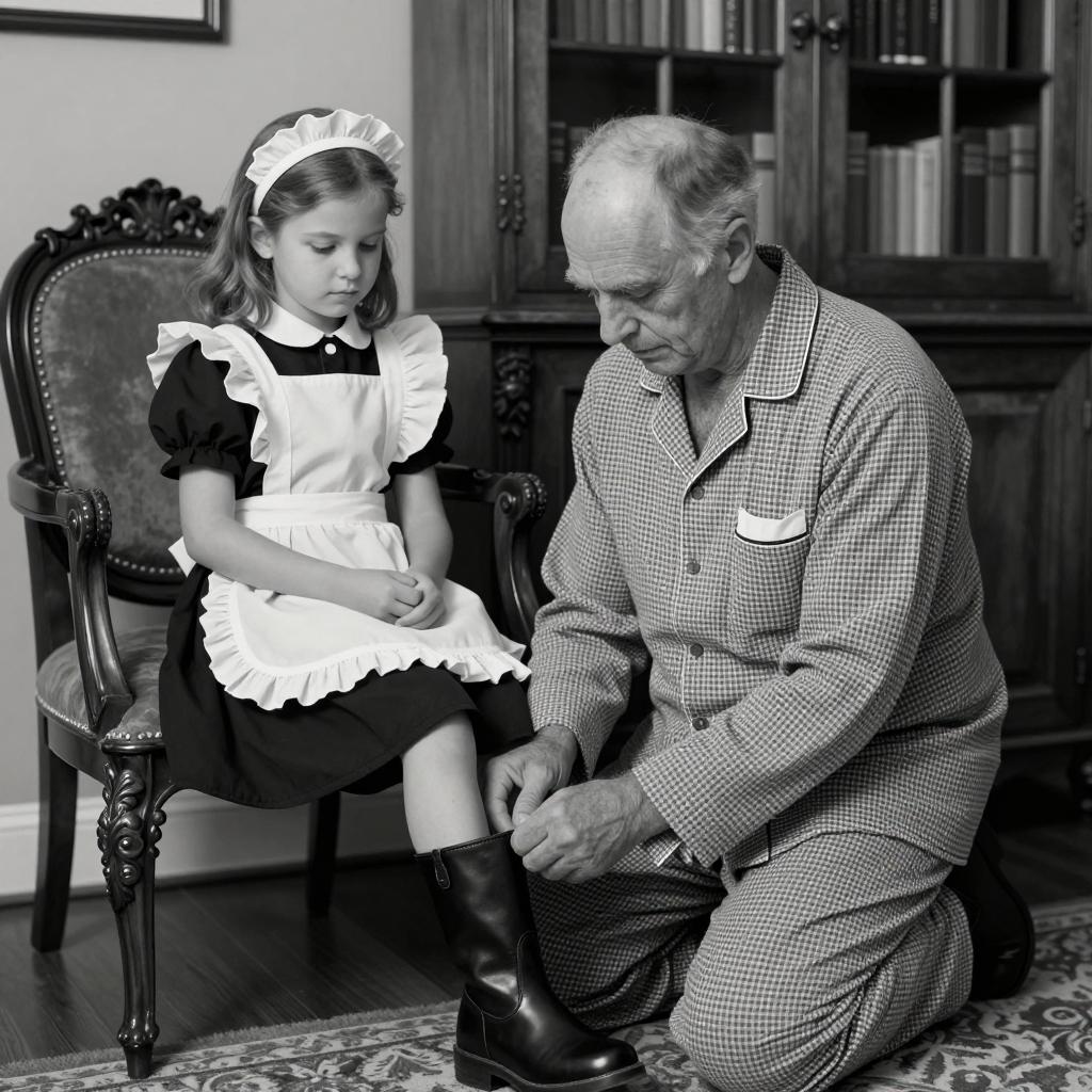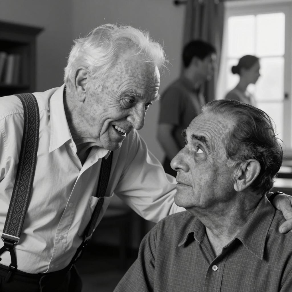 Black and white photograph of an elderly man with a white beard and a young girl with light-colored hair. Man wearing a suit and tie, girl in a coat with white piping. Man holds girl's chin gently, girl smiles. Background shows architectural details. Man's expression is gentle, girl's expression is joyful.