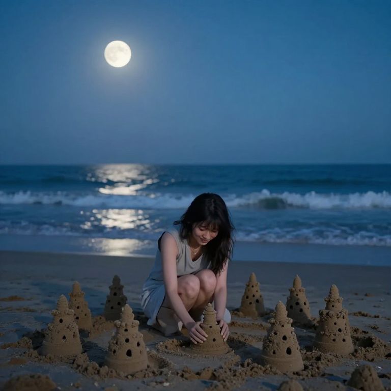 Under the moonlit sky, a solitary figure kneads sand into towers of fleeting dreams, embodying the ephemeral dance between creation and dissolution, where joy and melancholy intertwine in the soft whisper of waves and the cool touch of night.
