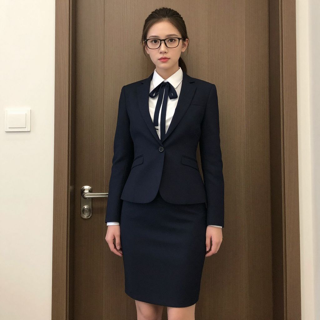 Photograph of a young woman standing in front of a wooden door. She has light skin, brown hair tied back in a neat bun, and is wearing black-rimmed glasses. She is dressed in a black suit with a white dress shirt and a black bow tie. The suit jacket is tailored, and she is wearing a matching black skirt that reaches mid-thigh. Her expression is neutral, and her hands rest by her sides. The door behind her has a silver handle on the left side. The lighting is even, highlighting her professional attire and the plain, brown-colored door.