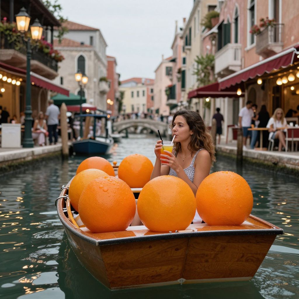 Photograph of a young woman with wavy brown hair, wearing a white sleeveless top, sitting in a wooden boat on a narrow canal in a picturesque European town. She sips a drink through a straw while surrounded by five large, bright orange oranges. The canal is lined with pastel-colored buildings featuring red awnings and lanterns. People are seen walking and dining at outdoor cafes on both sides. A small bridge is visible in the background, adding depth to the scene. The image has a vibrant, colorful, and lively atmosphere.