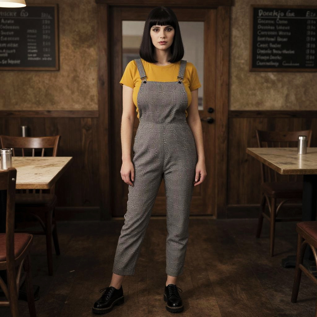 A woman, styled in a daguerreotype film aesthetic, wearing a mustard yellow t-shirt and grey checkered overalls, standing in a rustic wooden interior of a steakhouse, with black lug sole derby shoes and straight hair with blunt bangs. Sexy. Pretty face and beаutiful eyes. Big breasts