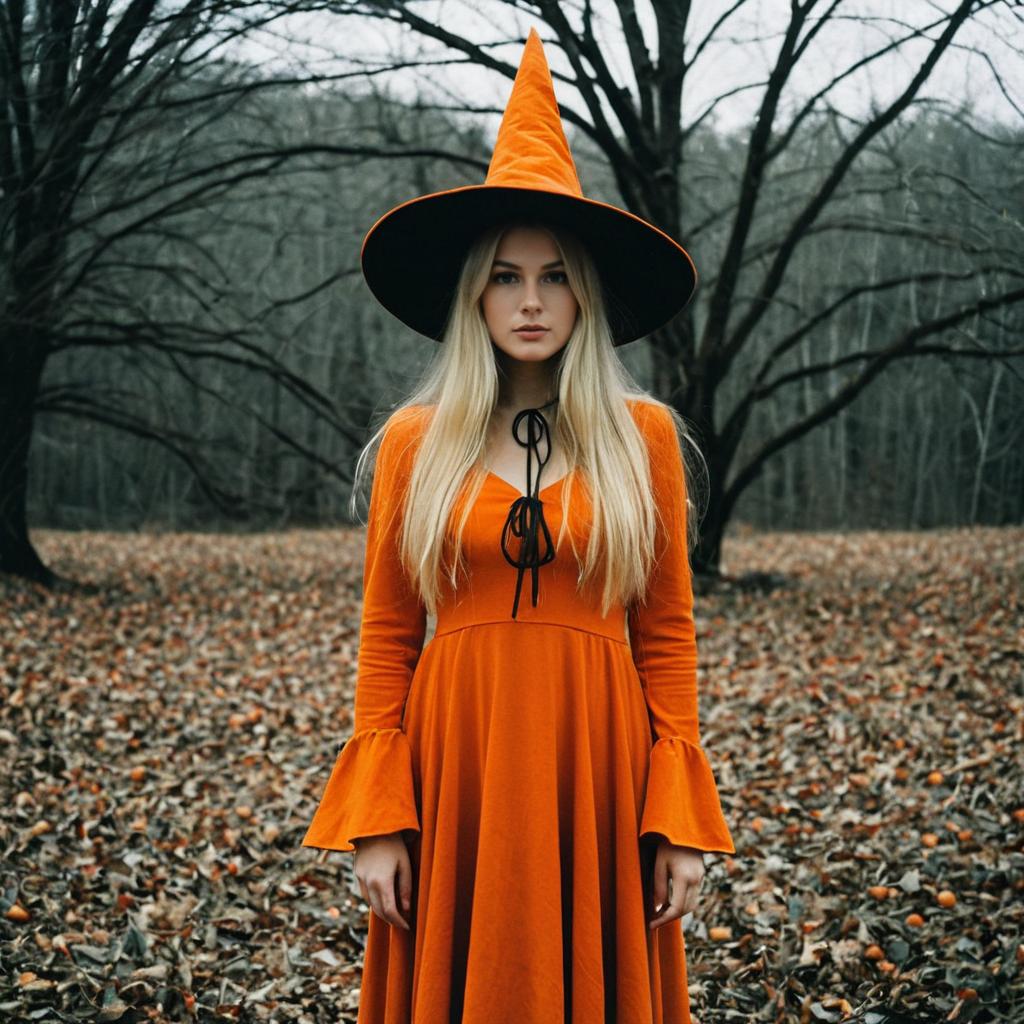 Halloween costume adults,1girl, solo, hat, long hair, witch hat, skirt, looking at viewer, witch, red headwear, red skirt, choker, pumpkin, orange hair, red hair, wavy hair, long sleeves, black shirt, realistic, shirt, closed mouth
