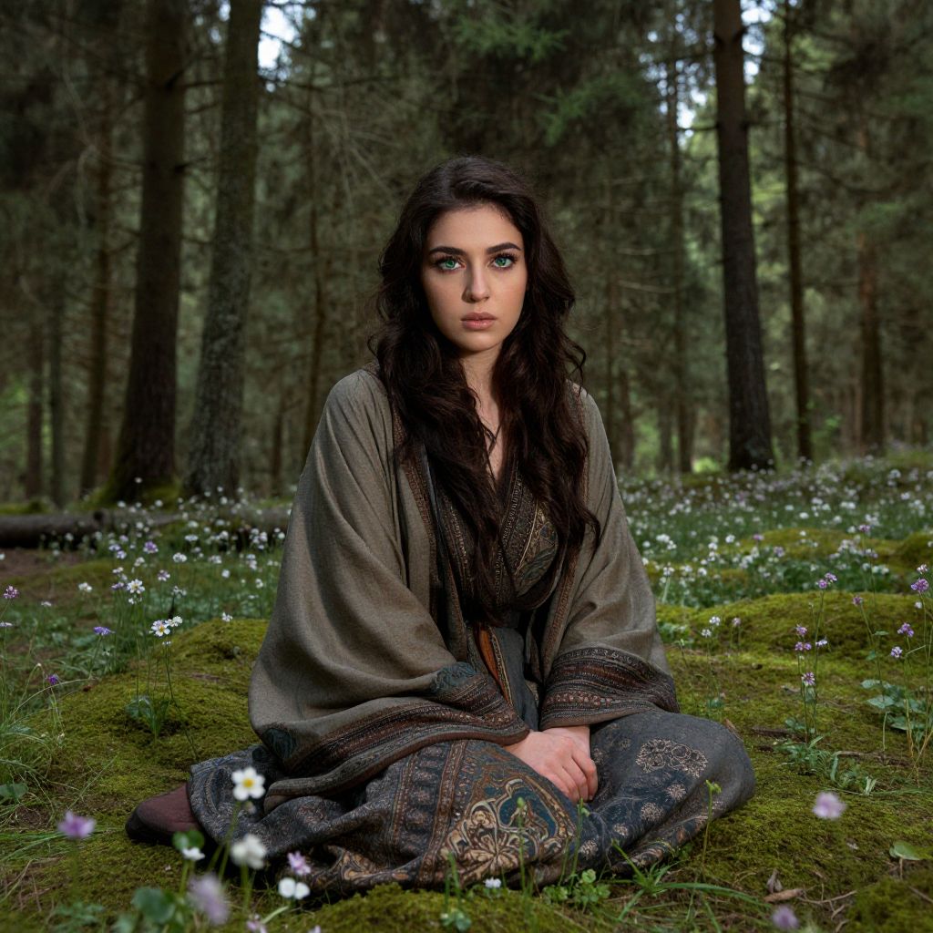 Envision a photorealistic portrait captured by a DSLR, showcasing an enigmatic Middle Eastern woman with piercing green eyes and fair skin, set against a serene mossy forest glade bathed in soft dappled sunlight filtering through towering evergreens. The viewer's gaze is drawn to her intense yet peaceful expression from a unique low-angle perspective as she gracefully sits amidst wildflowers. Her flowing robes adorned with intricate patterns seamlessly blend with the natural surroundings. This hyperrealistic portrait evokes a range of emotions, from tranquility to intrigue, highlighting the delicate interplay between subject and environment, all while maintaining a captivating depth and complexity.