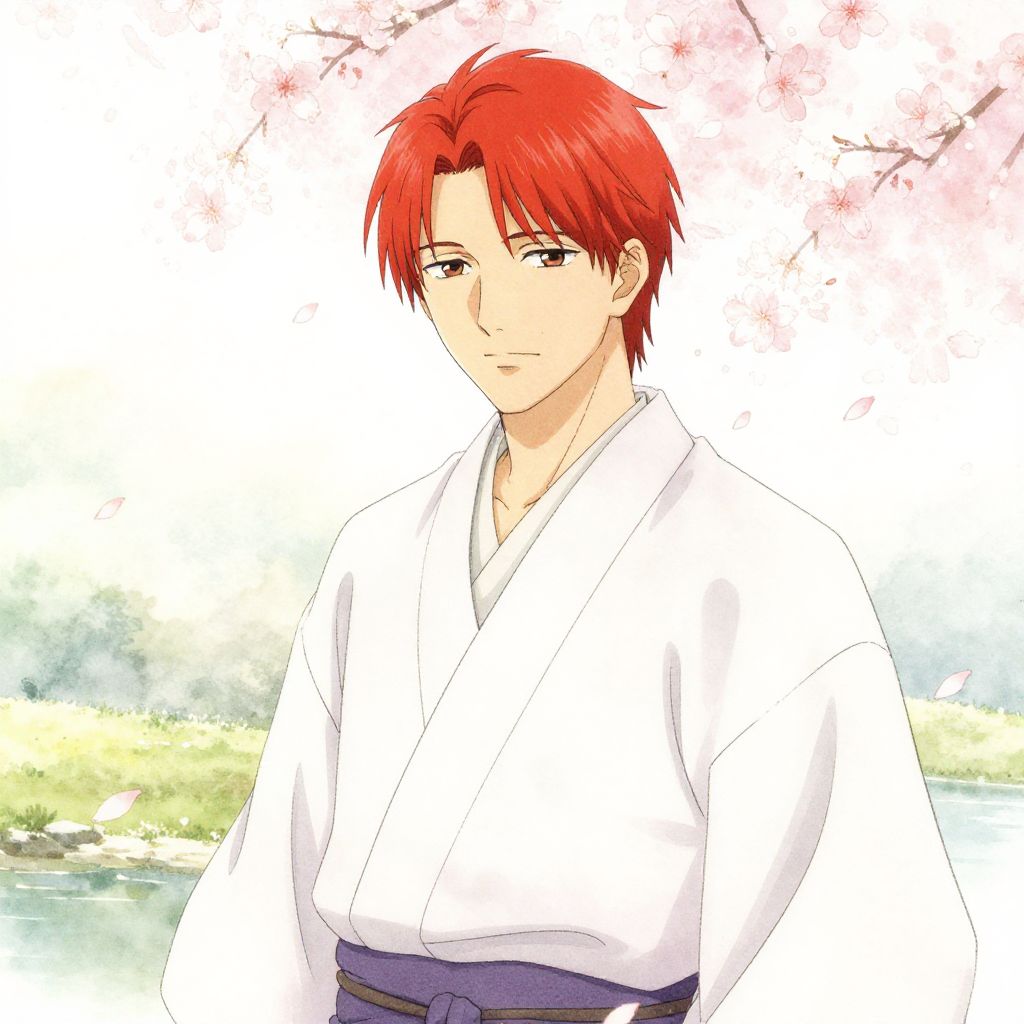 Anime guy with green hair sitting in a quiet bamboo forest, soft sunlight filtering through leaves, serene expression, traditional kimono with subtle patterns, delicate line art, atmospheric fog, peaceful and mystical mood with detailed background