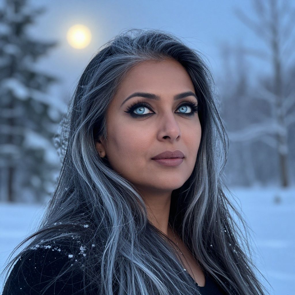 Portray a South Asian woman in her early 40s with porcelain skin and striking ice-blue eyes framed by dark lashes against a serene winter landscape bathed in soft moonlight. Her long hair, streaked with silver, cascades down to her shoulders, capturing the silvery glow and creating an ethereal aura. The low-angle perspective emphasizes her mysterious presence, as if viewed through a hidden window in the snow-covered forest. This ultrarealistic portrait blends landscape photography with hyperrealism, showcasing timeless beauty amidst nature's cold embrace.