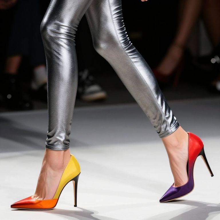Leggings with high heels, dynamic runway scene, futuristic fashion design with metallic leggings and sharp high heel shoes, bold color accents, high-contrast lighting highlighting fabric textures and shoe details, high fashion editorial aesthetic