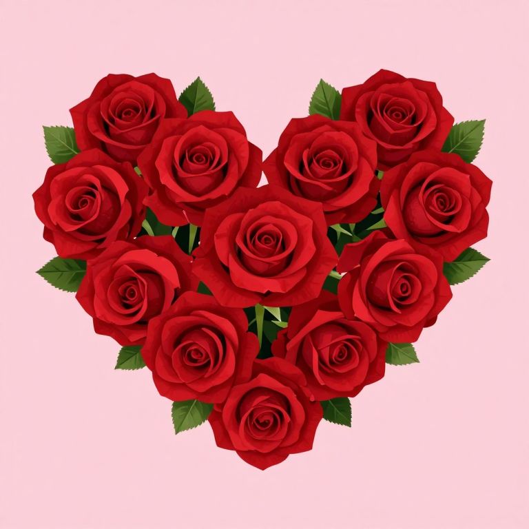 A vibrant digital illustration of red roses arranged in a heart shape, featuring detailed petals and green leaves, set against a soft pink background, evoking a romantic and celebratory mood perfect for Valentine's Day gifting.