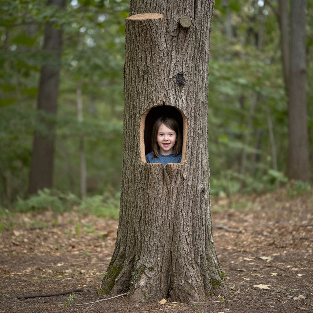 Photograph of a young girl with dark hair and a blue shirt, peeking from a circular hole in a forest tree trunk.