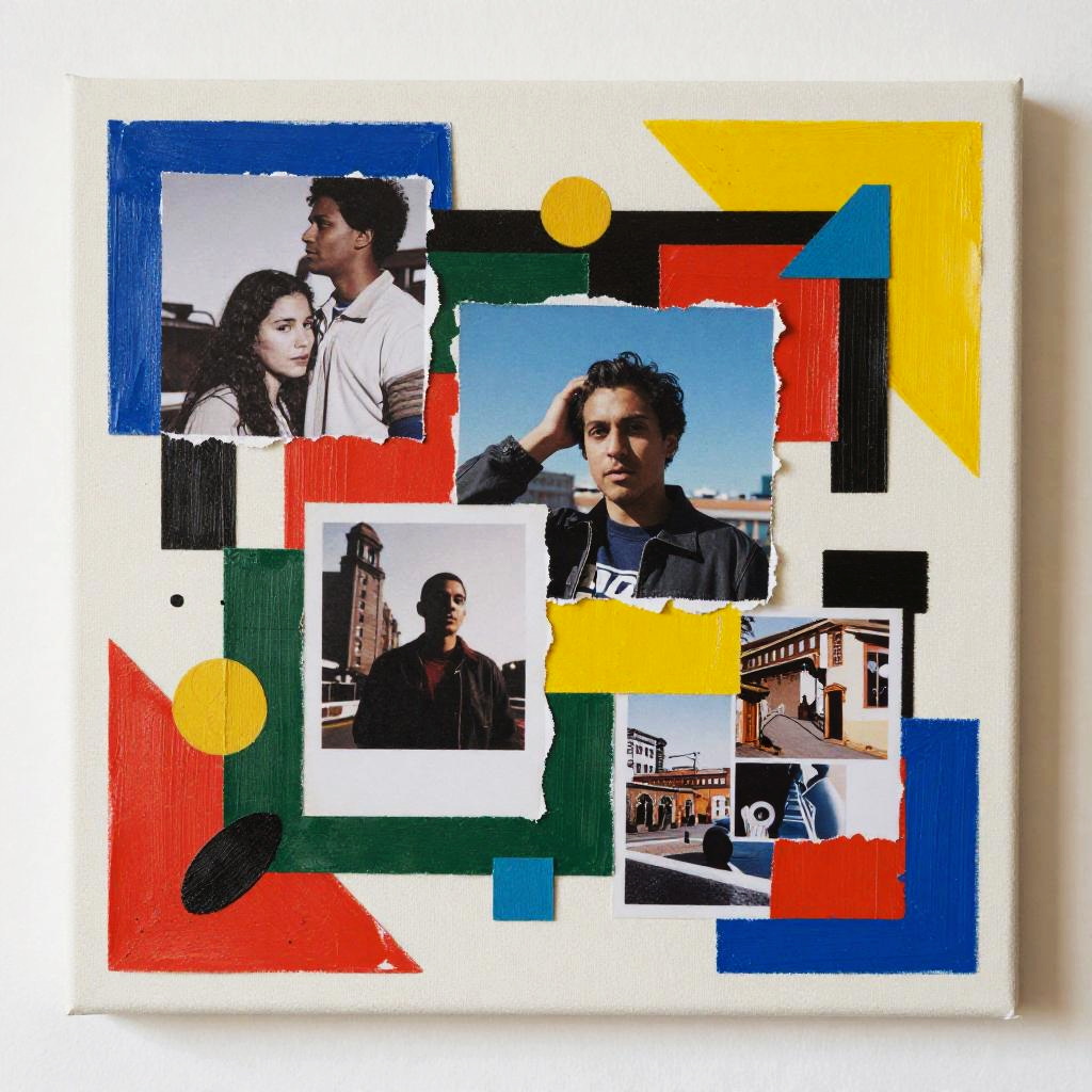 Collaje art featuring a vibrant mix of torn paper, photographs, and painted textures layered intricately on a canvas, dynamic composition with bold colors and abstract shapes creating a visually striking modern collage.
