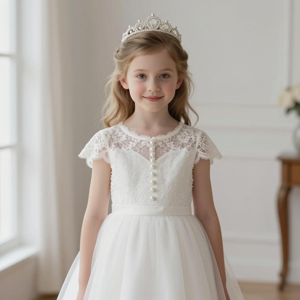 Nice christening dress, photograph of young girl wearing white wedding dress, light brown hair, subtle wave style, small tiara, white lace sleeves, pearl buttons down center, full skirt, standing against soft white background, natural light from window, gentle smile, fair skin, slight blush, elegant, delicate, traditional wedding attire, soft focus, vintage feel