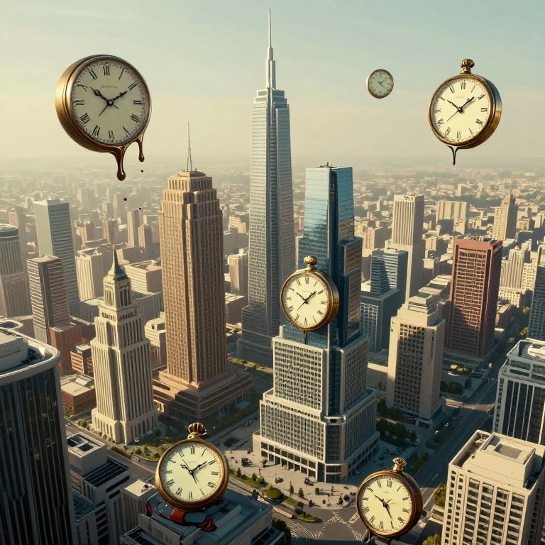 Digital art of a cityscape with multiple floating vintage clocks, showing various times, above tall skyscrapers under a clear sky.