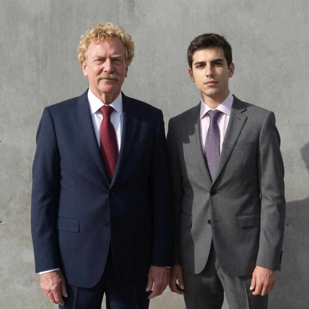 Photograph of two men standing against a gray concrete wall. The older man with curly blonde hair and a mustache wears a dark blue suit, white shirt, and red tie. The younger man with short dark hair wears a gray suit, light pink shirt, and patterned tie. Both men look at the camera with neutral expressions. Sunlight casts shadows on the wall.