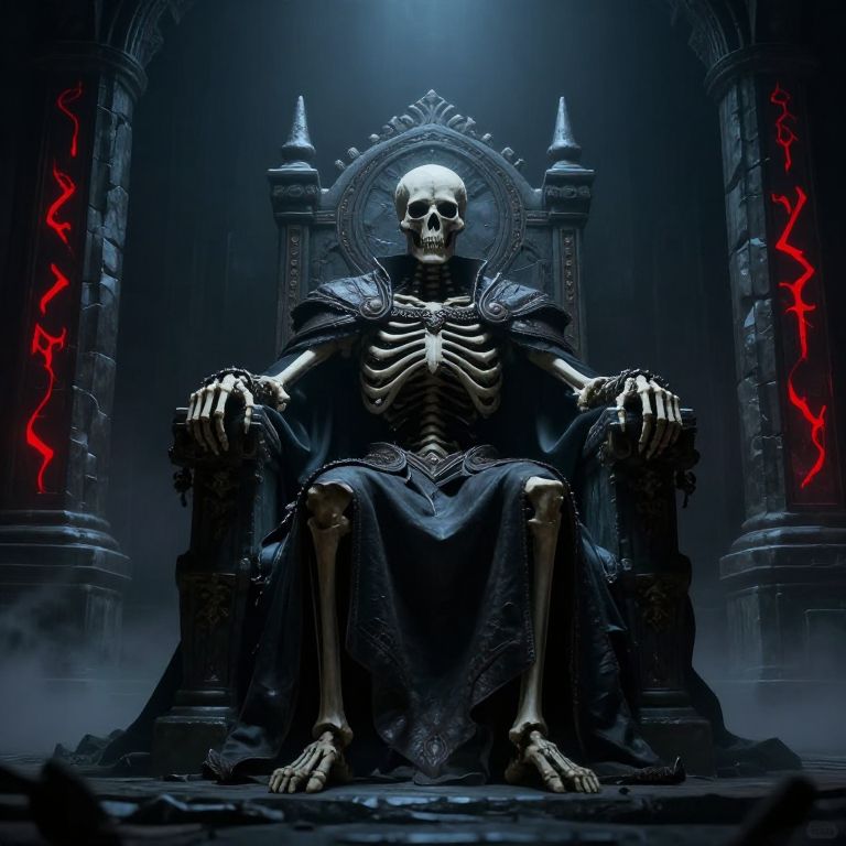 Digital artwork depicting a skeletal figure seated on a grand, gothic throne. The skeleton, with a hollow eye socket and bony hands resting on the throne's armrests, wears a dark, tattered robe. The throne is ornate, with intricate carvings and a circular, halo-like design on the backrest. The background is dark, with blue and red glowing, jagged runes on each side of the throne. Mist swirls at the base of the throne, adding a mysterious atmosphere. The lighting highlights the skeleton's bones and the throne's details, creating a dramatic, eerie effect.