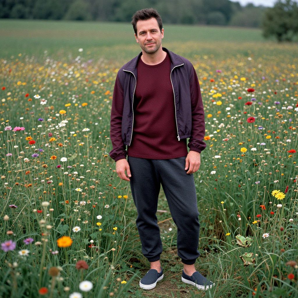 A man, deep burgundy thermal shirt, dark grey jogger trousers, minimalist slip-on sneakers, cropped windbreaker, vibrant wildflowers, soft croaking frogs, ib technicolor film stock, relaxed smile, enjoying nature.Man has masculine face and piercing eyes