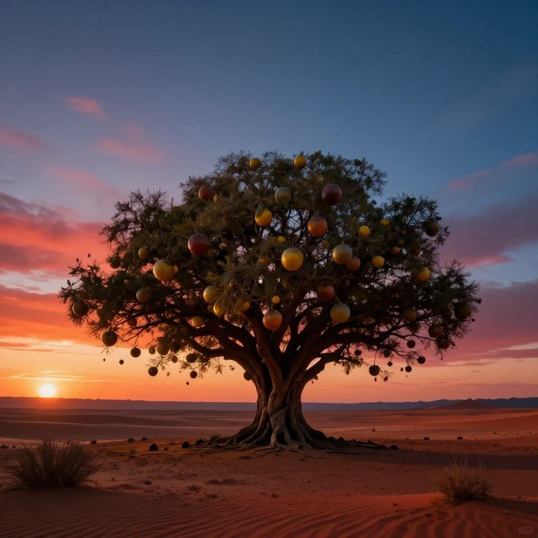Imagine an otherworldly digital landscape reminiscent of surrealist art, where a colossal tree dominates the arid expanse of a desert, its boughs heavy with fruit that seems to defy gravity, falling upwards towards the heavens. This scene is captured from above, emphasizing the enigmatic nature of the tree and its peculiar produce. The environment's color palette is rich and dynamic, blending the deep crimson and gold hues of the sunset with the cool, ethereal blue of twilight, creating an atmospheric emotional gradient that stirs a sense of wonder and intrigue about the hidden mysteries of this fantastical realm.