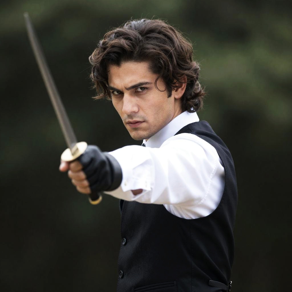 Photograph of a muscular man with dark, wavy hair and tan skin, wearing a sleeveless, black, V-neck top, punching forward with his right fist. His face shows intense determination. He has small, gold earrings. Background features a clear blue sky and distant, blue-green mountains. His left shoe is beige with a thick sole. He is in a dry, rocky area with sparse greenery. The man is the only person in the image.