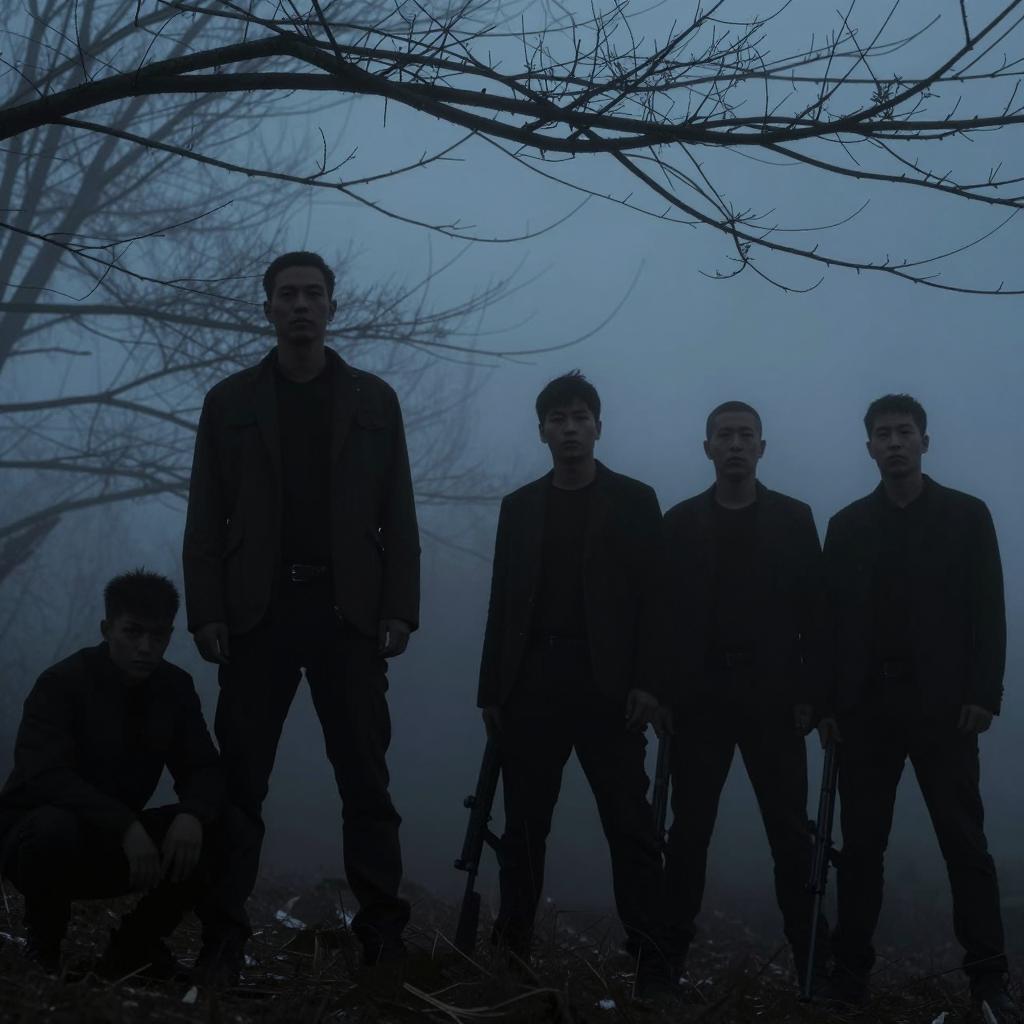 Four silhouetted people in a dimly lit, industrial room with blue-green lighting. Two spotlights create sharp beams. People stand in a semi-circle, faces mostly in shadow. Metal railings and round structure in background.