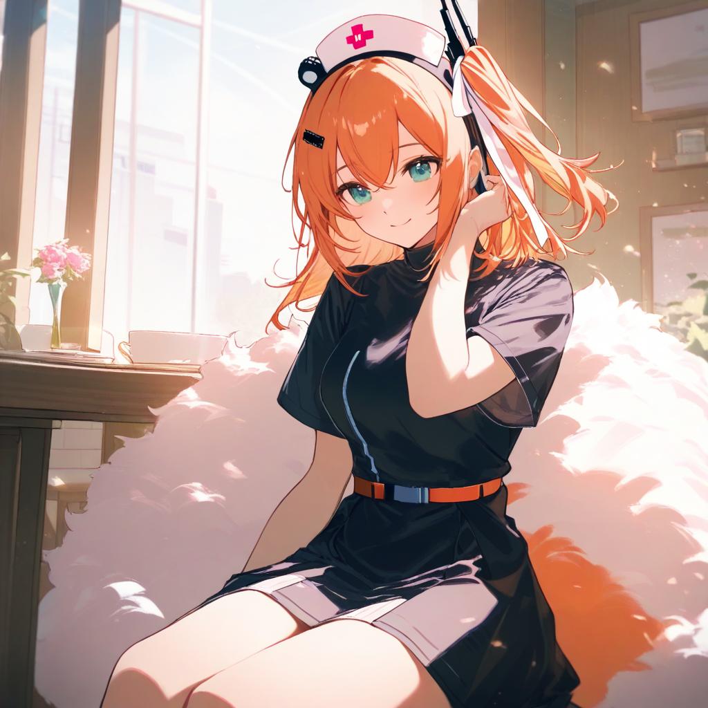 Cowboy shot, adachi rei, nurse cap, pastel pink hair, sea green eyes, fluffy, black dress, sitting, indoors, window, long hair, smile, fluffy, pink headband, comforting gaze, cozy cafe corner, colorful burst of prism glow