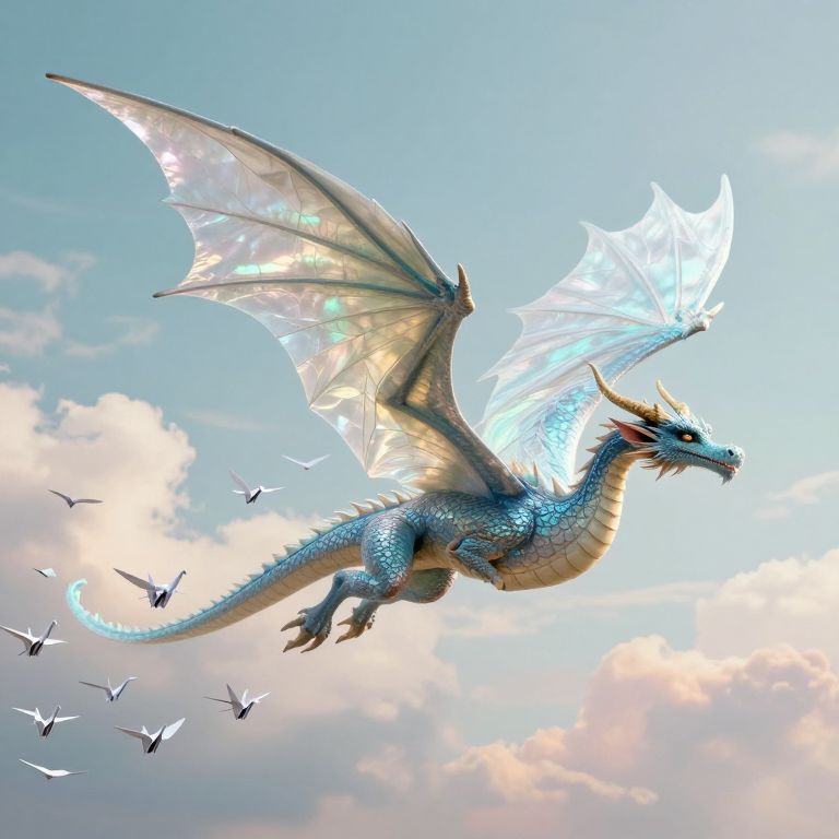 A majestic dragon with translucent, leaf-like wings soars gracefully among a flock of delicate paper cranes, its scales shimmering against a sky painted with soft, ethereal clouds.