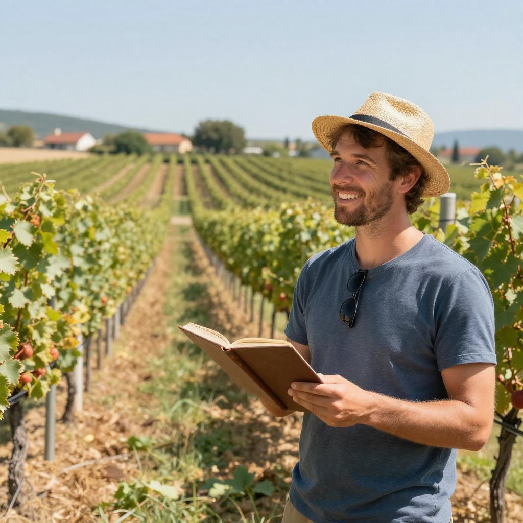 A cheerful man wearing a straw hat and a blue t-shirt holds an open book while standing in the middle of a vineyard. Rows of grapevines stretch out behind him under a clear sky, with rural houses in the background. The setting captures the essence of agricultural tourism and rural charm.