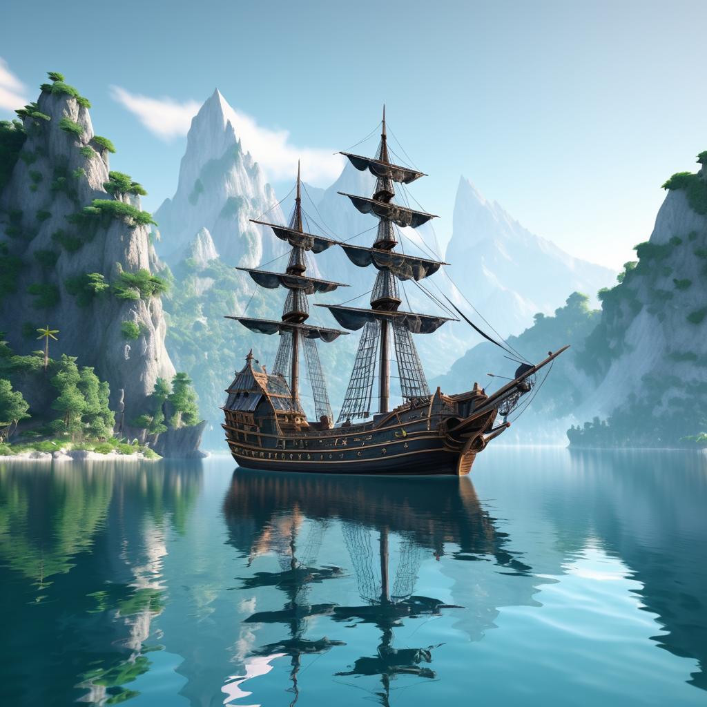Pirate ship sailing through a serene lake with mountains reflecting on the water surface. Ultra-detailed concept art, trending on ArtStation, HD quality.
