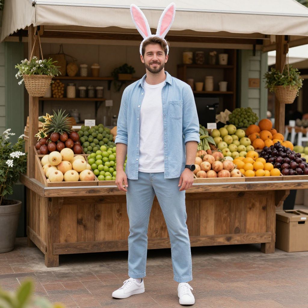 "Easter Outfit Casual, man in bunny costume standing in front of produce stand"