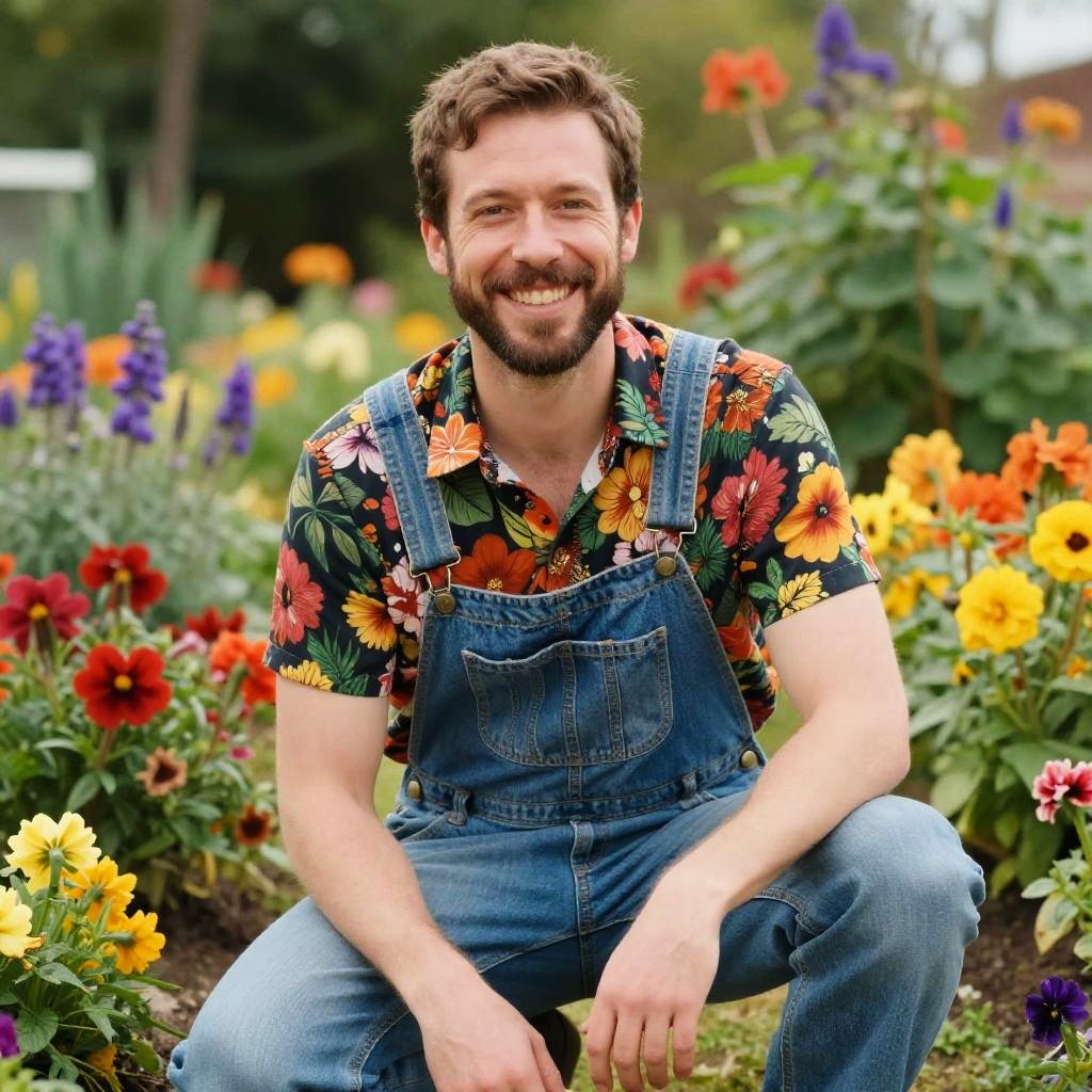 Photograph of a bearded man with brown skin, wearing white shirt, light blue jeans, white sneakers, and pink bunny ears, standing in front