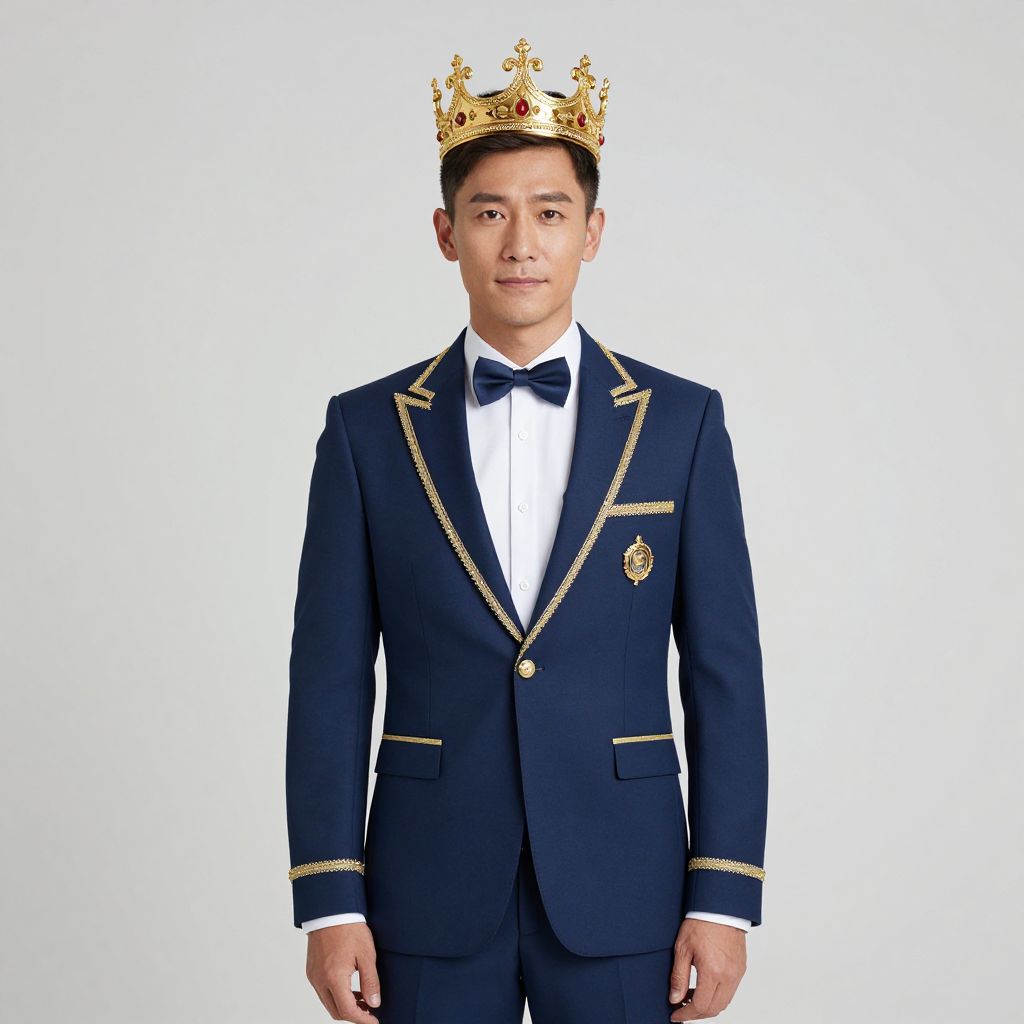 Emperor fancy dress, image of a man in a blue suit and gold crown