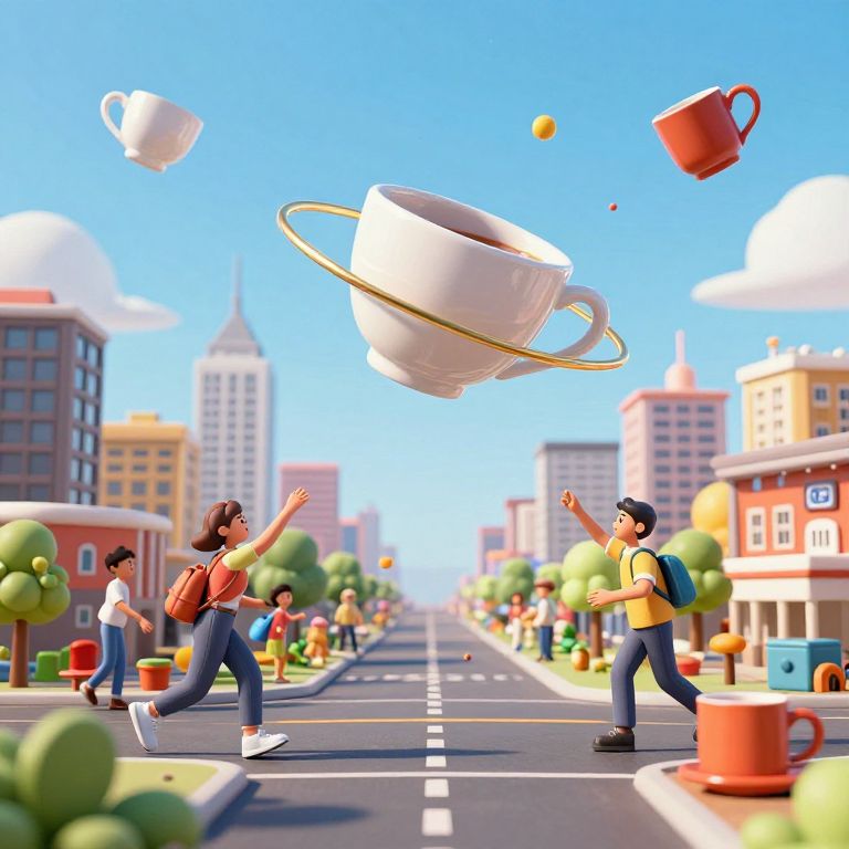 In a vibrant, bustling cityscape rendered in high-definition 3D realism, citizens engage in a whimsical zero-gravity contest, launching teacups and other everyday objects into surreal, floating orbits against a clear blue sky, creating an imaginative blend of urban life and fantastical physics.