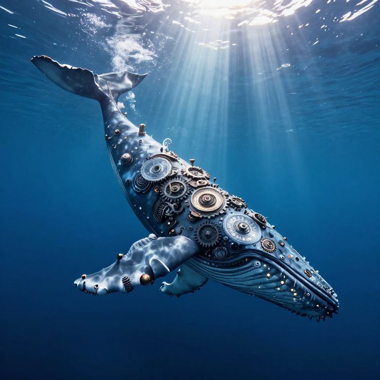 Colossal clockwork whale glides gracefully upside-down through a sunlit underwater cavern, its intricate gears and circular panels glowing faintly as beams of light pierce the deep blue waters.