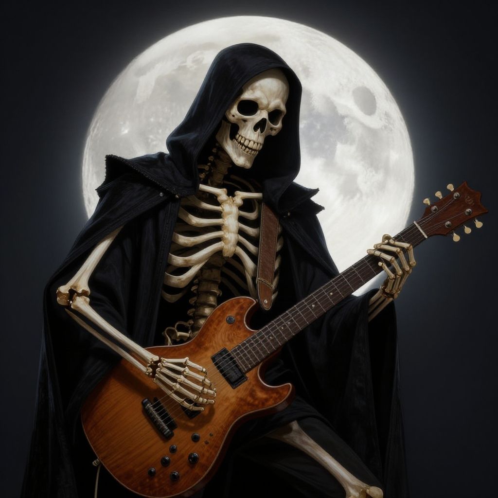 A skeleton playing guitar in front of a full moon, digital art by mike bierek, artstation contest winner, lowbrow, portrait of skeletor, king of time reaper, skeletor, digital fantasy art, in stunning digital paint, (octane render) fantasy style, photorealistic anime render, aesthetic octane render!, detailed matte fantasy portrait, dark, digital fantasy illustration, elegant digital painting