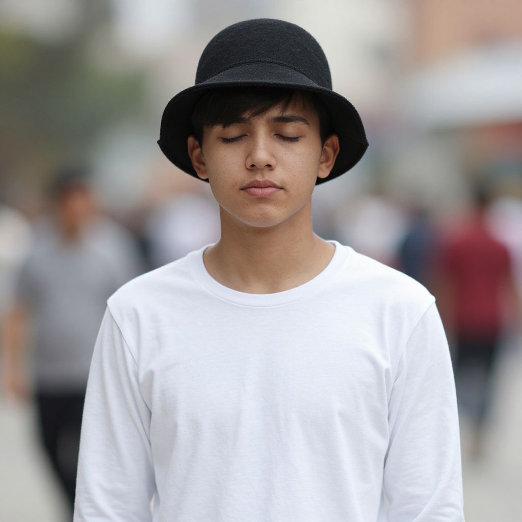 "national costume every, solo, 1boy, male focus, outdoors, blurry background, blurry, closed eyes, long sleeves, facing viewer, hat, black hair Realistic photo of casual sexy person with pretty face"