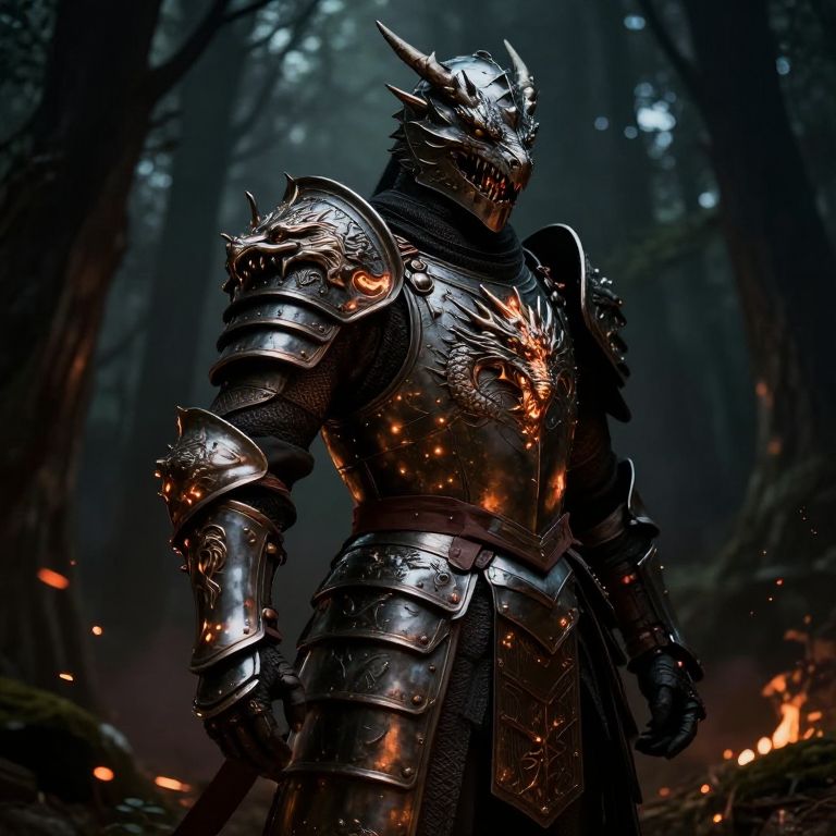 Dragon armor concept art illustrating a battle-worn armor crafted from dragon hide and enchanted metals, adorned with embossed dragon motifs and fiery accents, warrior poised in a dark forest illuminated by embers, moody atmosphere with dramatic shadows and fine details.