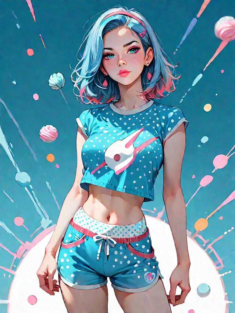 Digital illustration of a young woman with short vibrant blue hair wearing a sporty cobalt blue cotton bralette and matching boyshorts featuring playful white polka dots and an elastic waistband. She is leaning on a surface in a room with blue polka dot walls, holding a white stuffed toy. The outfit has a racerback design and breathable, comfortable fabric, embodying a casual sporty style.