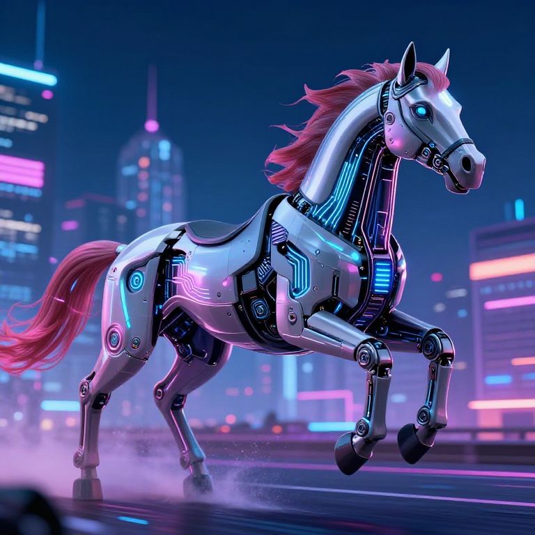 AI horse, a futuristic mechanical horse with glowing circuits and sleek metallic body, galloping across a neon-lit cyber city at night, blending advanced technology with equine grace, digital art style with vibrant colors and dynamic lighting