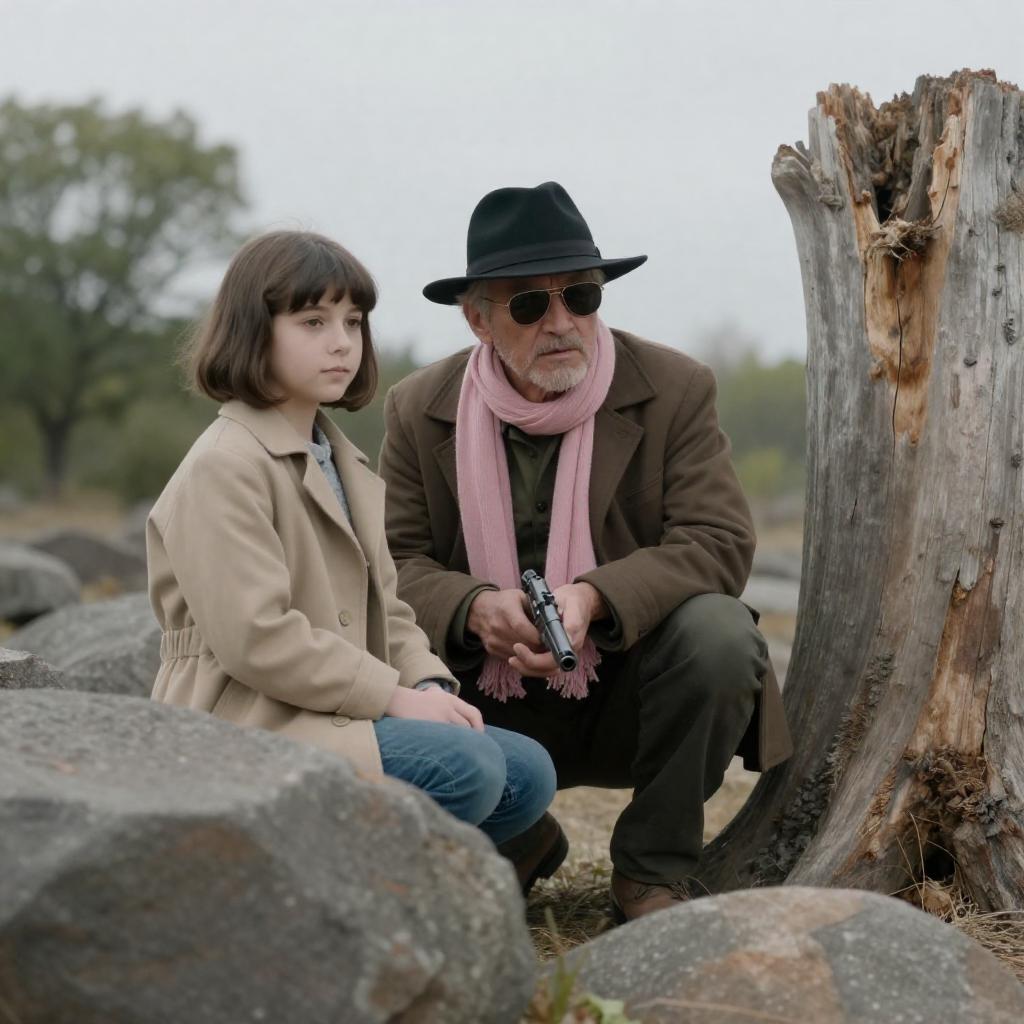 Older man with gray beard and brown jacket walks through tall grass field, followed by two children. Dense forest in background. Children wear light gray and brown clothes. Overcast lighting. Man's focused expression. Children's faces not clearly visible.