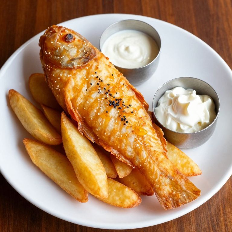 Photograph of a golden-brown, crispy fish fillet with black pepper, served with fries and two metal cups of creamy dipping sauce on a white