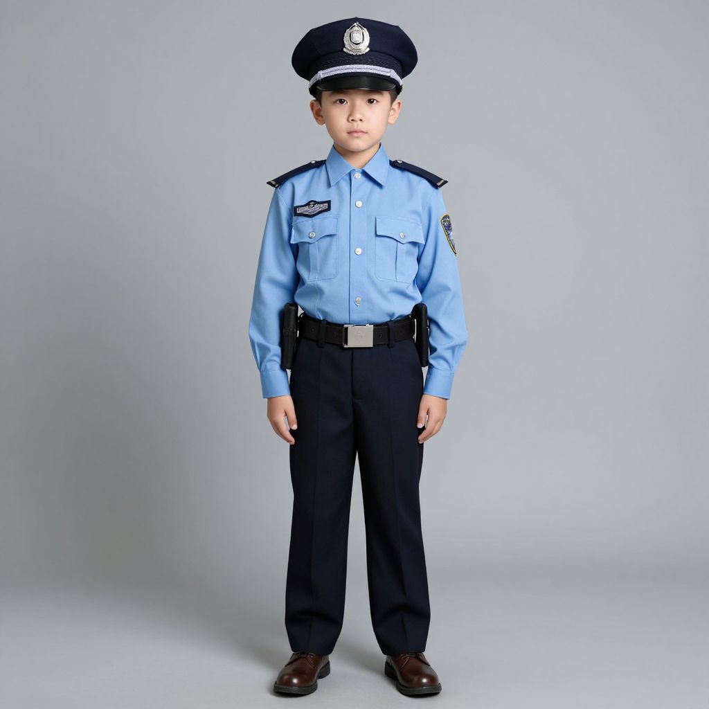 Full body portrait of an Asian boy wearing a blue police uniform consisting of a long-sleeve collared shirt with breast pockets and black pants. He is also wearing a peaked police cap, black belt, and brown shoes, standing against a plain grey background with arms at his sides.