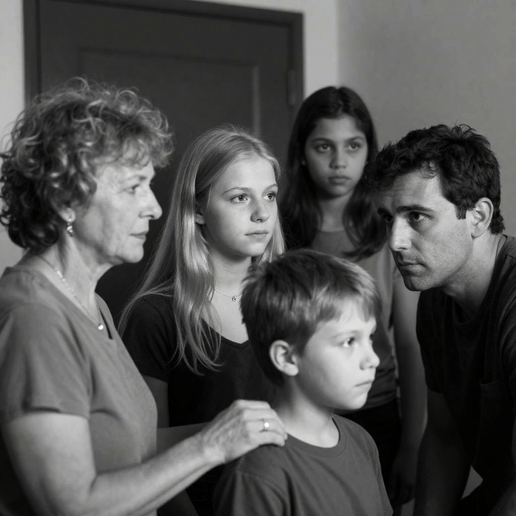 Black and white photograph of a family. Father in suit and tie, smiling at daughter, who wears floral dress, stands between parents. Mother with curled hair, smiling at daughter. All three touching, facing each other. Daughter's curly hair. Background is blurred.