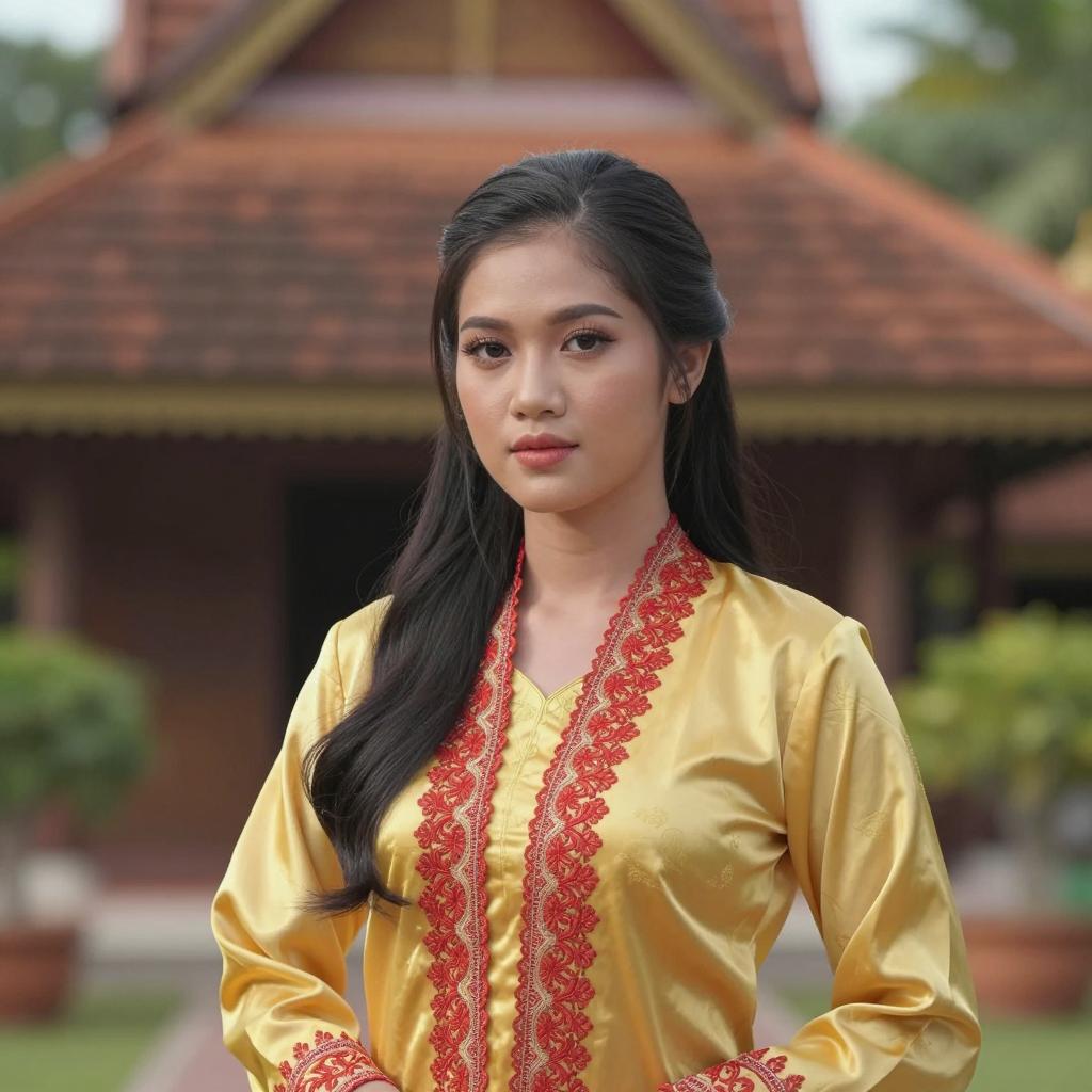 Malaysian costume female, photorealistic portrait of young Asian woman, standing outdoors in front of traditional building, wearing traditional yellow and red embroidered silk robe, long black hair in simple style, subtle makeup, neutral expression, daytime, soft sunlight, background with blurred greenery and roof, warm colors, elegant and serene atmosphere, realistic ures, slightly bokeh effect