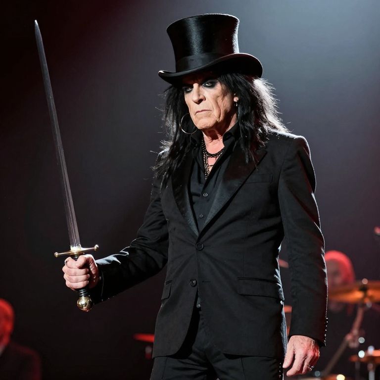 Photograph of a middle-aged man with long black hair, wearing a black top hat, black suit, and black shirt, holding a sword in his right hand. He has pale skin, dark eye makeup, and a serious expression. The background is dimly lit with a spotlight highlighting him, and faintly visible musicians with instruments can be seen in the blurred background. The overall style is reminiscent of gothic rock or dark fantasy, with dramatic lighting and a mysterious atmosphere.