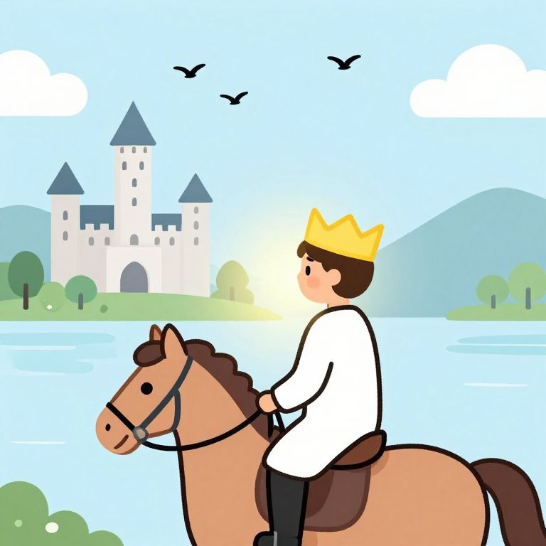 Catchlight prince riding on a horse and looking at a Kingdom with a castle, in the background mountains and a lake, with birds in the sky, white clouds in the sky, Minimalist Cartoon Art Styles,
