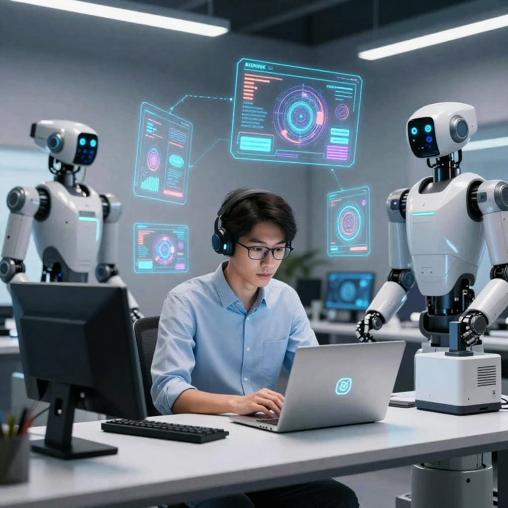 Visual AI creator at work in a futuristic studio filled with advanced robots and AI assistants, surrounded by augmented reality tools and creative holograms, illuminated by soft ambient lighting, ultra-realistic and dynamic scene