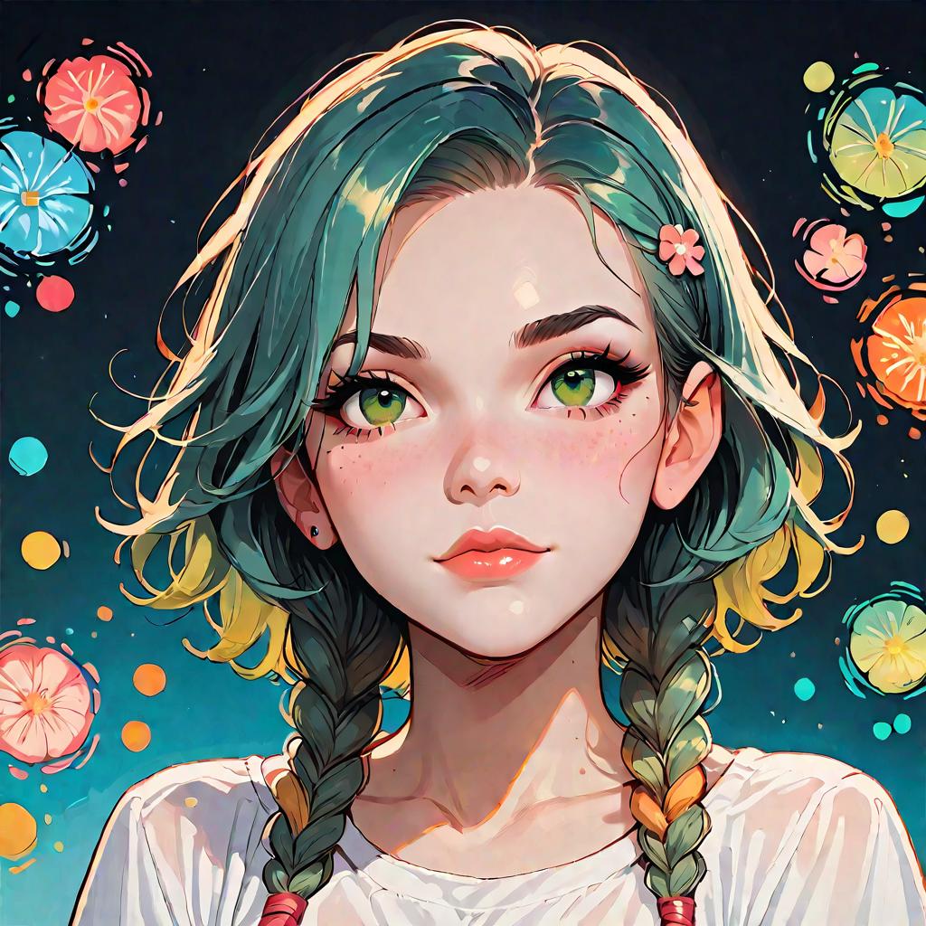 Masterpiece, best quality, highly detailed, score_9, score_8_up, score_7_up, score_6_up, source_Anime, 1girl, solo, flower, hair flower, blonde hair, green eyes, hair ornament, smile, long hair, eyelashes, freckles, looking up, dress, purple dress, upper body, artist name, braid, blush, puffy sleeves, simple background, lips, collarbone